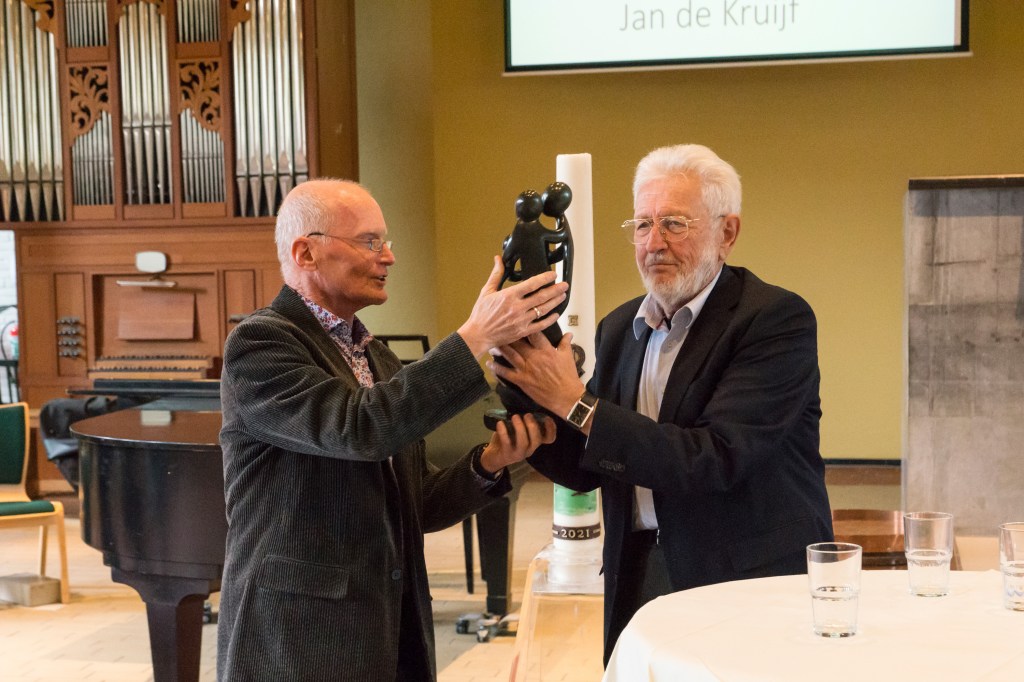 Vervolgens leidt Peet Valstar het afscheid van Jan de Kruijf in met een hartelijk dankwoord. Hierin schetst hij de grote verdiensten en kwaliteiten van Jan gedurende 15 jaar bestuurswerk bij Omduw. Zoals zijn daadkracht en doortastendheid en zijn ondernemende rol bij nieuwe hulpinitiatieven. Ook roemt hij zijn inzet voor het behoud van een onafhankelijke positie van Omduw ten aanzien van de kerken en de gemeente en voor de professionalisering van Omduw als vrijwilligersorganisatie.