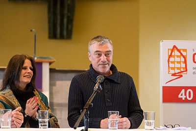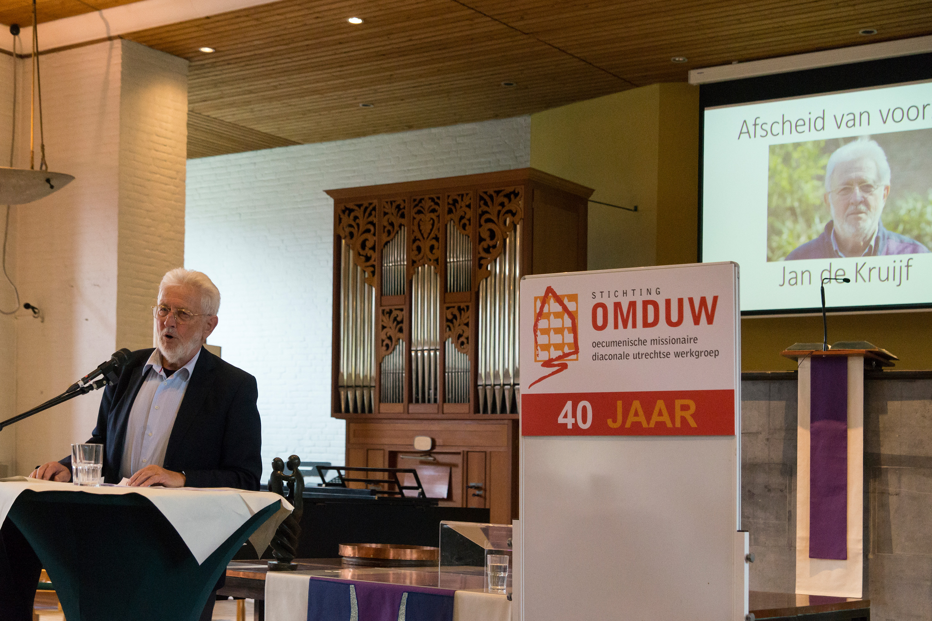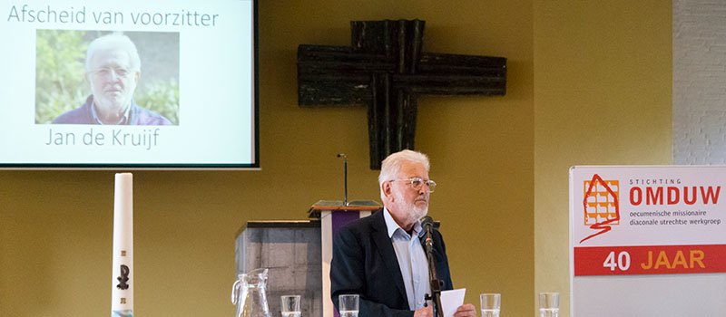 Vervolgens leidt Peet Valstar het afscheid van Jan de Kruijf in met een hartelijk dankwoord. Hierin schetst hij de grote verdiensten en kwaliteiten van Jan gedurende 15 jaar bestuurswerk bij Omduw. Zoals zijn daadkracht en doortastendheid en zijn ondernemende rol bij nieuwe hulpinitiatieven. Ook roemt hij zijn inzet voor het behoud van een onafhankelijke positie van Omduw ten aanzien van de kerken en de gemeente en voor de professionalisering van Omduw als vrijwilligersorganisatie.