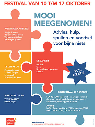 Van 10 tot en met 17 oktober organiseert de Armoedecoalitie in Utrecht diverse activiteiten, waar minima hun voordeel mee kunnen doen. Zo wordt er in drie wijken een Wegwijs-wandeling op touw gezet. In diezelfde wijken staat een Deeldiner op het programma onder het mom ‘Hoe (over)leef je met een laag inkomen’. Verder kunnen mensen tijdens een dialoog met elkaar over een bepaald onderwerp in gesprek. Die op 16 oktober – in samenwerking met de gemeente – vormt de opmaat naar de nieuwe nota over de aanpak van armoede en schulden. We geven in die week trouwens o.a. kaartjes weg, waarmee mensen met een kleine beurs gratis naar theater, festival of film kunnen gaan. Tot slot staan we op 17 oktober stil bij de viering van Internationale armoededag.